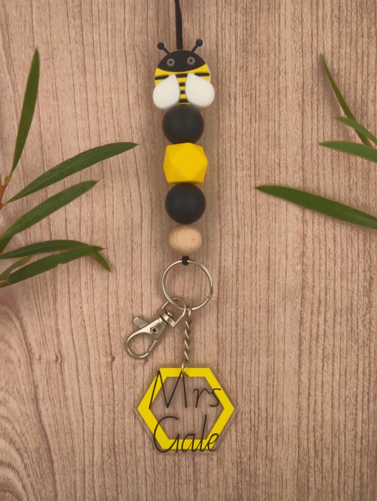 Our lanyards are approximately 50cm long, sitting at a comfortable length for every day tasks and all day wearing. They feature silicone and beech wooden beads, a breakaway clasp, black nylon cord, clip and split ring and a personalised tag.