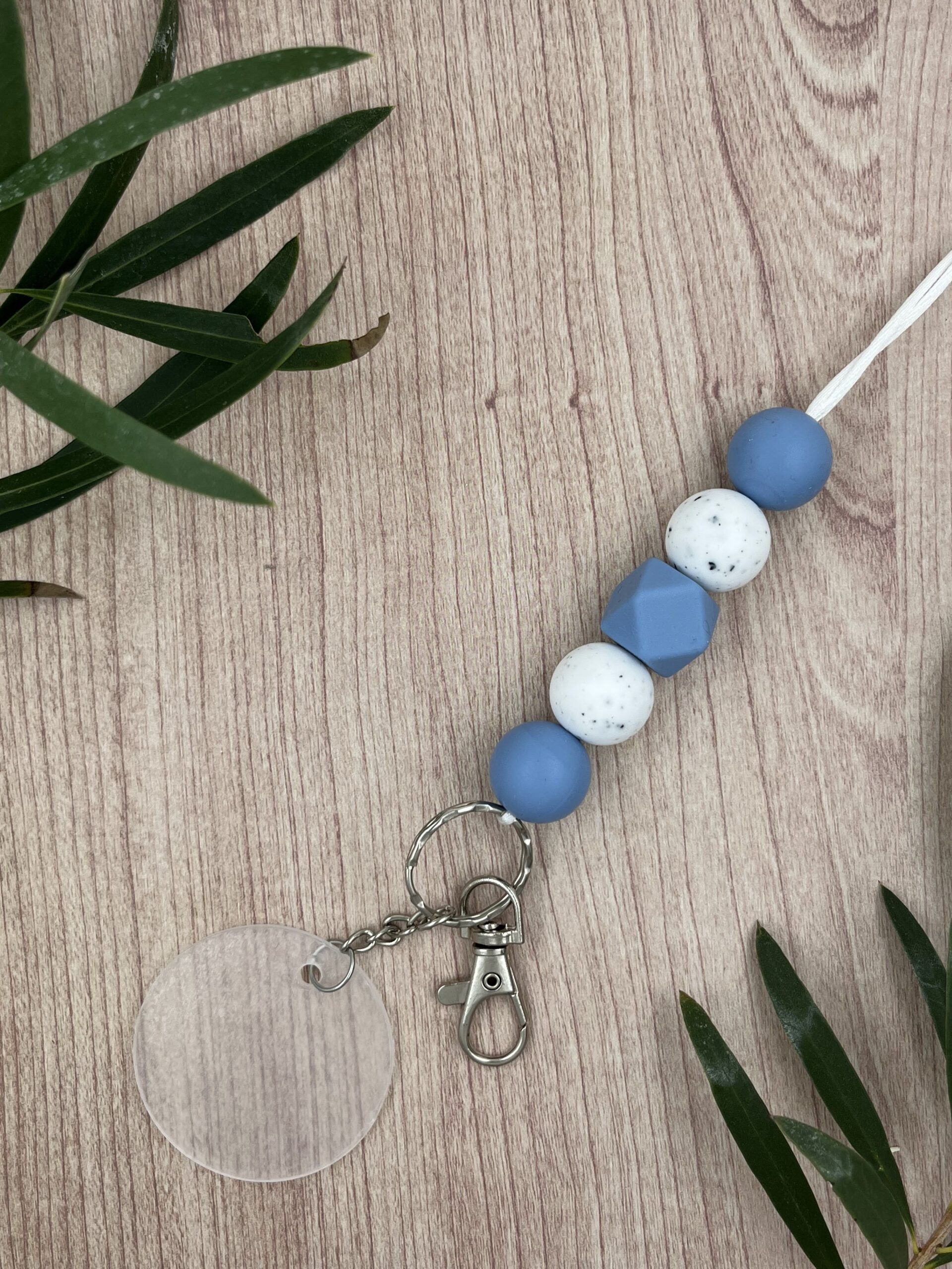 The Cornflower Marble lanyard features silicone beads, a breakaway clasp, grey nylon cord, clip, split ring and a personalised tag.