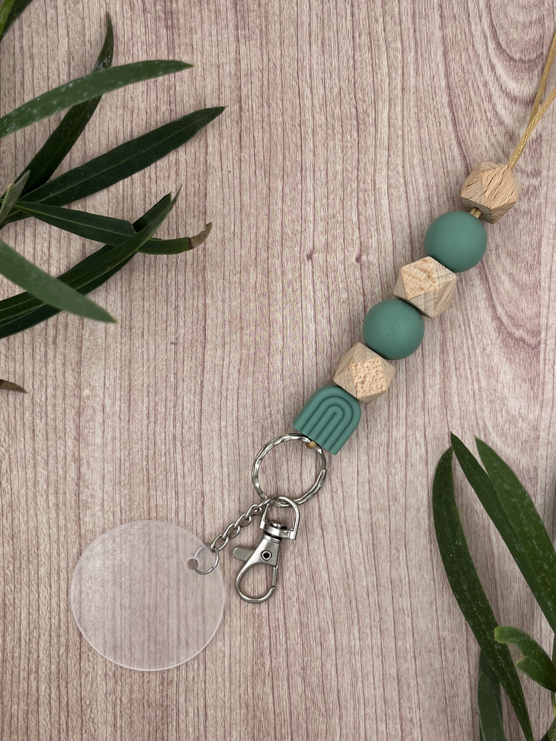 Handmade lanyard with wooden hexagonal and dusky green round and arch beads.