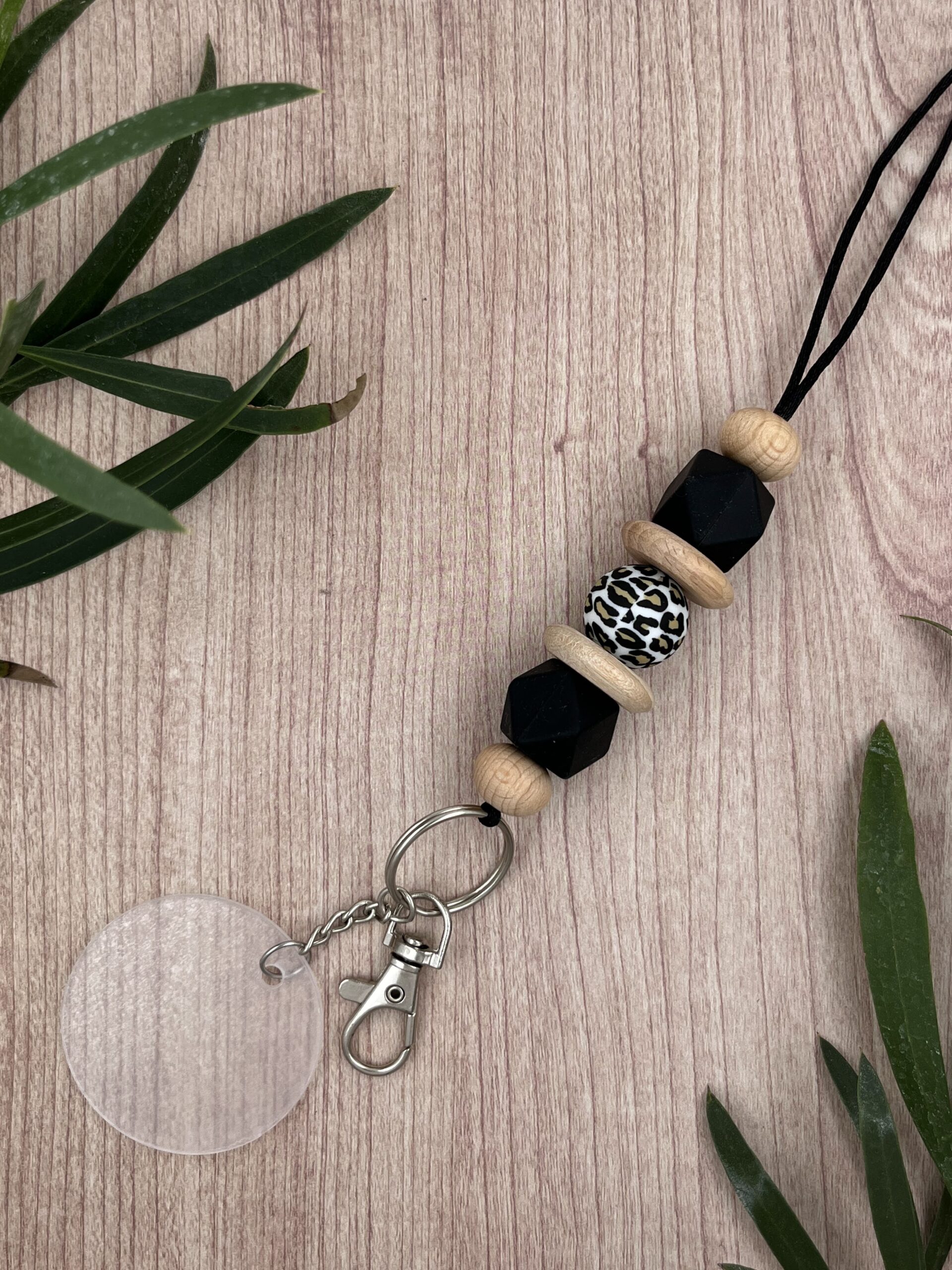 Handmade lanyard with wooden, black and animal print beads.