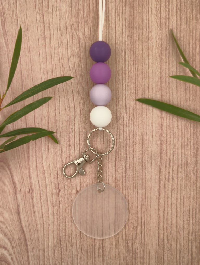 The Purple Ombre lanyard features silicone beads, a breakaway clasp, white nylon cord, clip, split ring and a personalised tag.