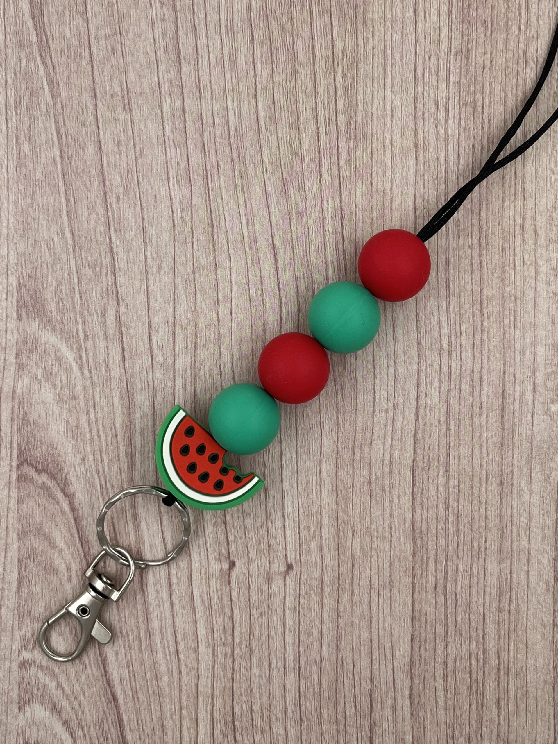 Handmade lanyard with bright green and red beads with a sweet watermelon feature bead.